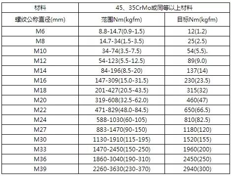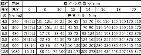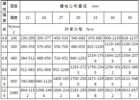 表2列出部分常用规格螺栓不同性能等级所对应的紧固扭矩值。