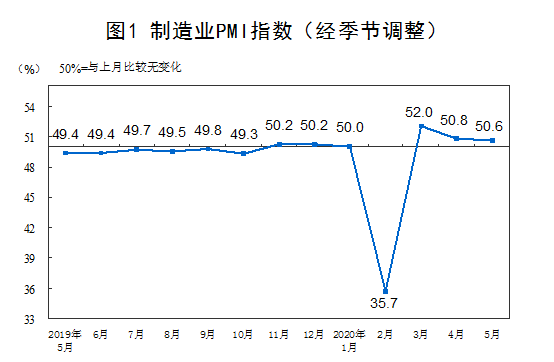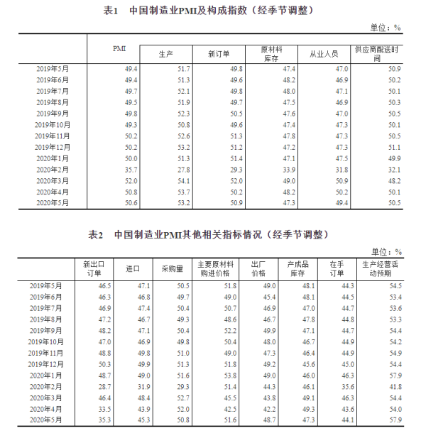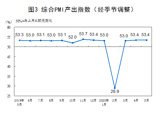 当前,我国上下统筹推进疫情防控和经济社会发展,经济运行恢复势头稳中向好。2020年5月份,制造业采购经理指数和非制造业商务活动指数均保持在临界点以上,其中制造业采购经理指数为50.6%,比上月小幅回落0.2个百分点;非制造业商务活动指数为53.6%,比上月上升0.4个百分点。综合PMI产出指数为53.4%,与上月持平。