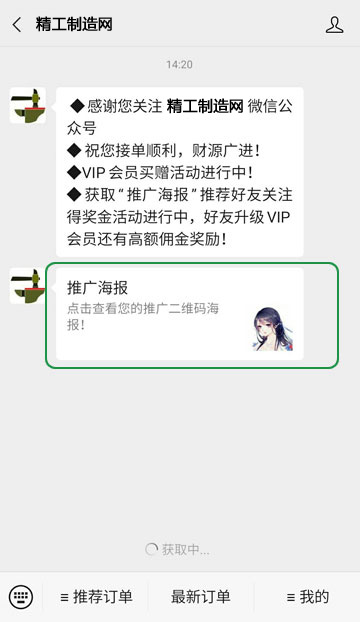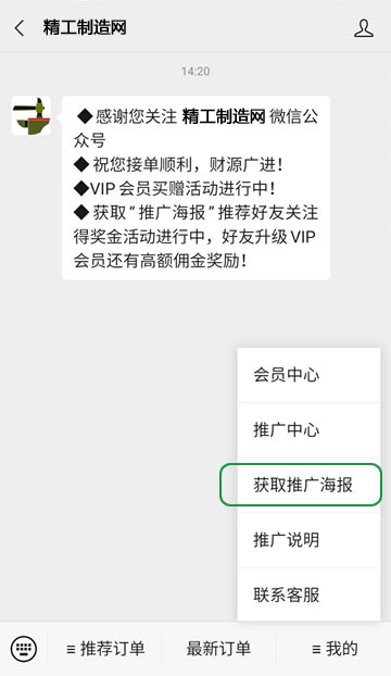 关注“匠品外协”公众平台后,点击公众号底部菜单“我的”,点击“获取推广海报”后,点击公众号推送的链接,便可生成推广海报图片,长按海报图片保存到手机相册,发送给好友、发布朋友圈、发布到微信群,或线下印刷打印张贴。好友通过推广海报二维码关注微信公众号,推荐人会收到通知消息,好友购VIP会员,推荐人会收到佣金发放通知消息。佣金可在“推广中心”查看!